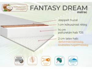 - Levehető, mosható steppelt huzat borítja a matracot. Antiallergén, hipoallergén. A szivacsbetét kényelmes alvást biztosít. Jellegzetessége a légáteresztő kókuszrost réteg. Kétoldalas matrac, különböző keménységű oldalakkal rendelkezik.