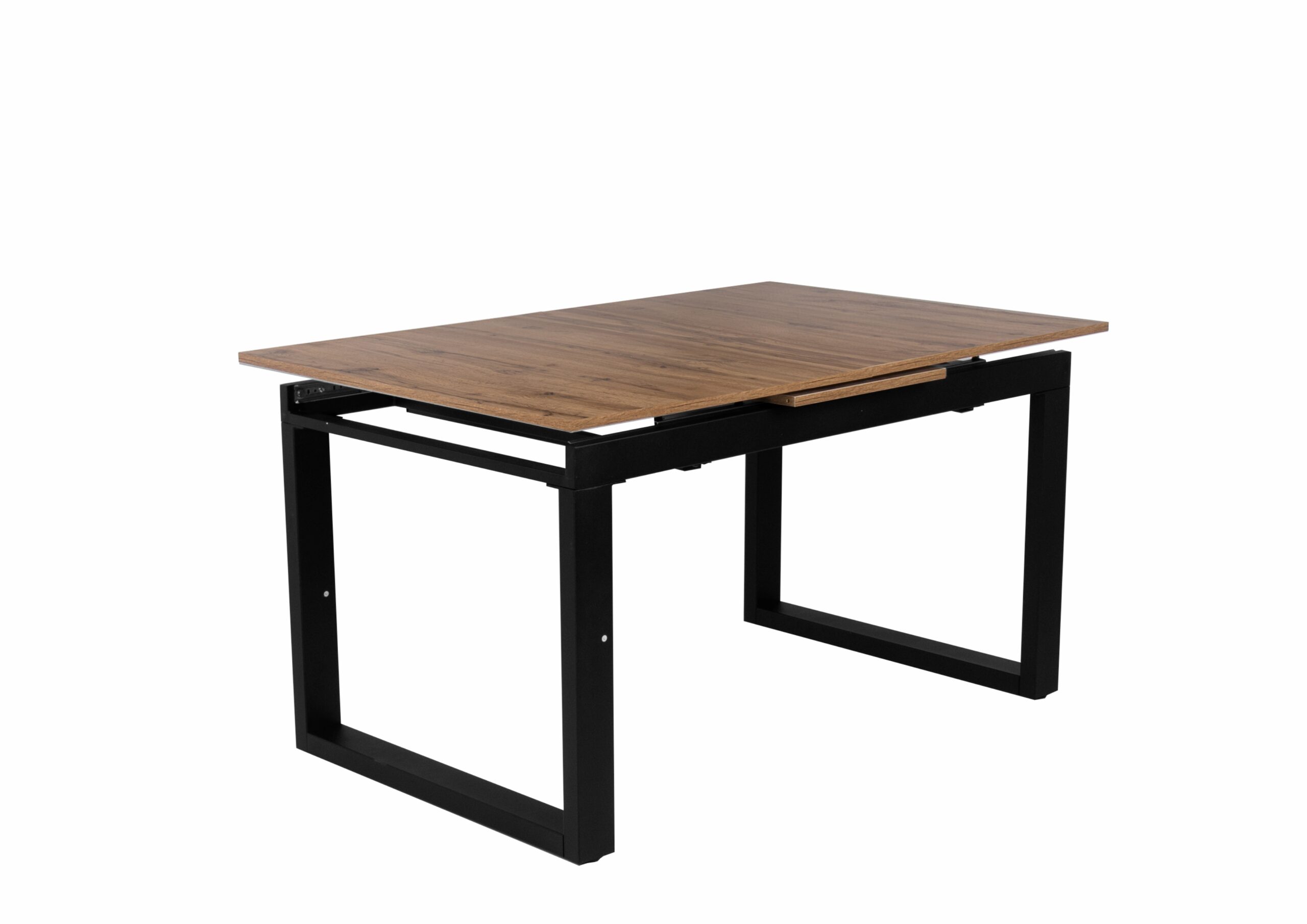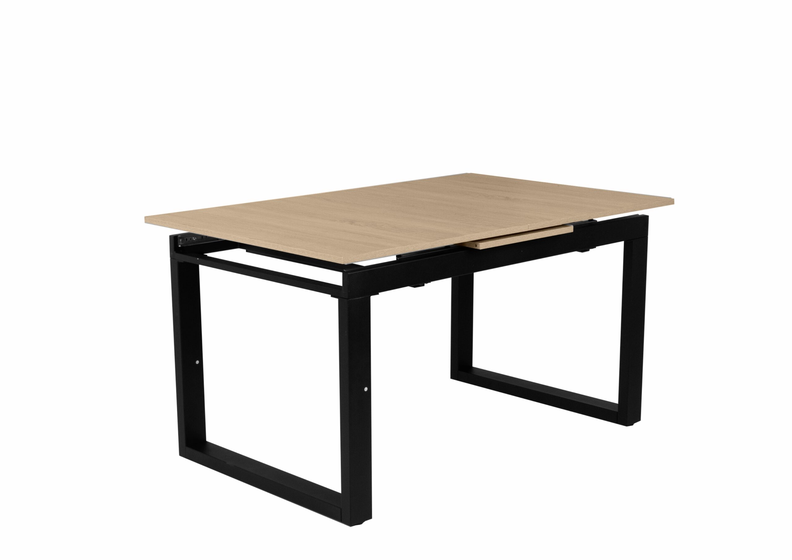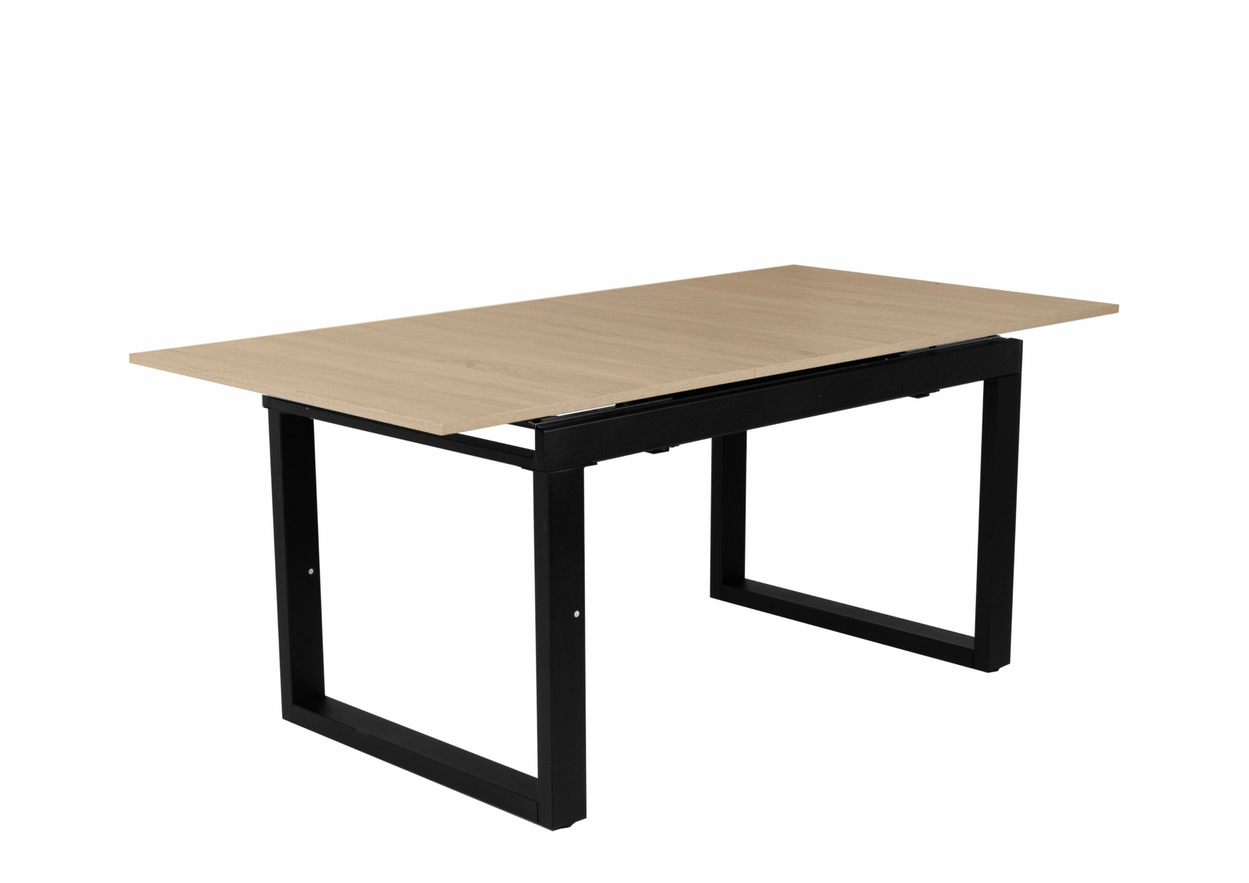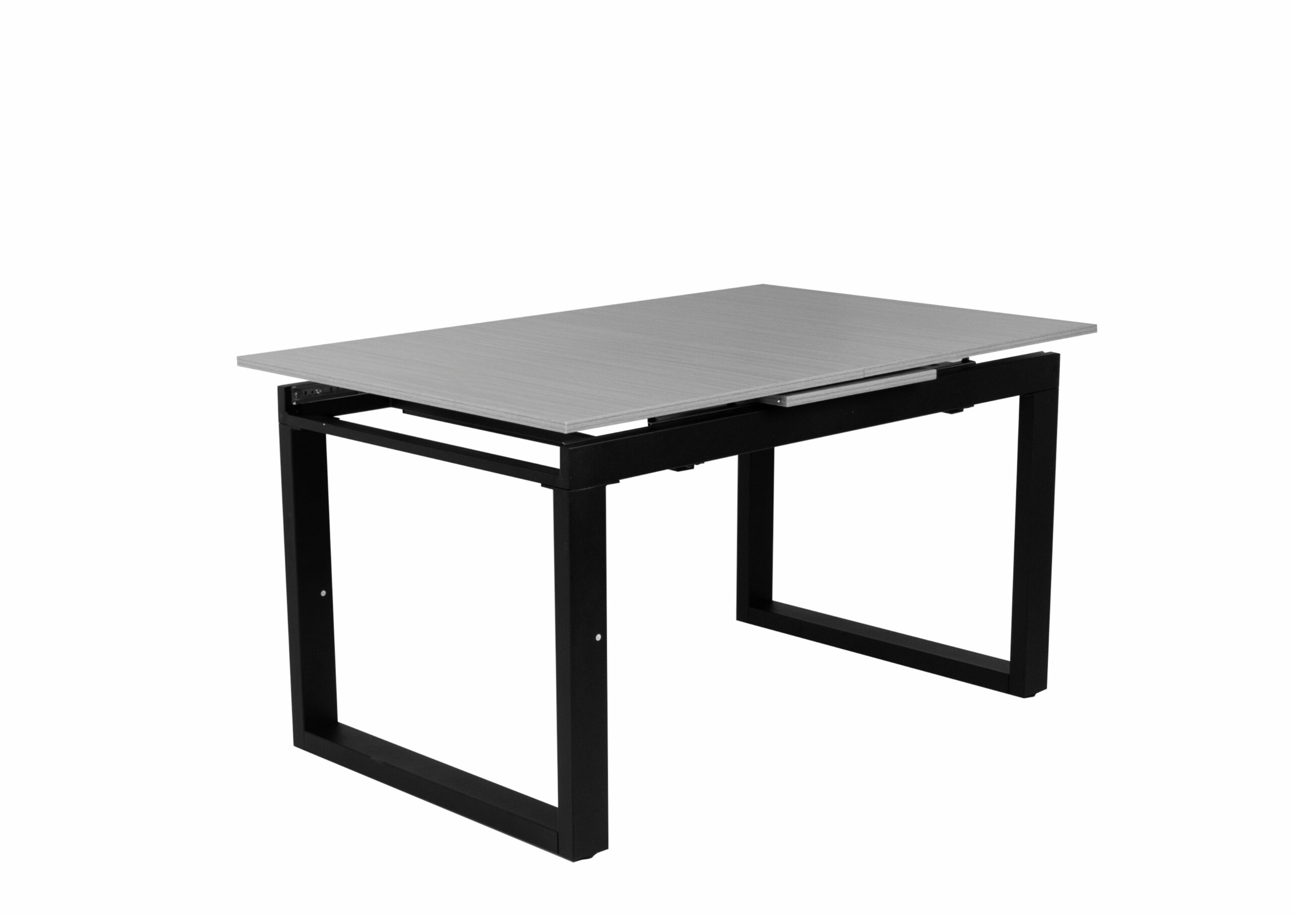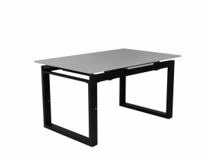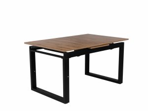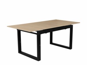 Laminált asztallap, fekete porfestett fém láb, szinkron asztalvasalat.